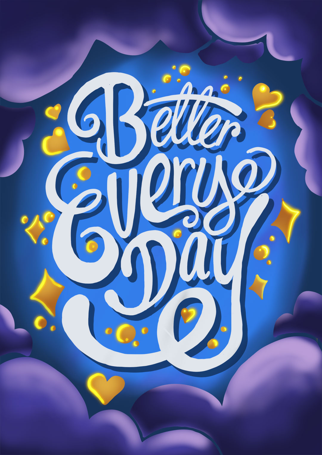 Vinithra Mammen’s talk about ways to create balanced lettering compositions got me started on taking the theory I was picking up throughout the days’ lectures and applying it in practice. She was the last speaker for Day 2 – so afterwards I could mess around with the prompt she gave viewers (“Better Every Day”). It was a good excuse to work outside of my comfort zone, at the time I had done very few lettering pieces digitaly. It turned out well – and to my surprise, even recieved a featured shout out in the Typism blog post (“Celebrating artwork from the Typism Skill Summit“).